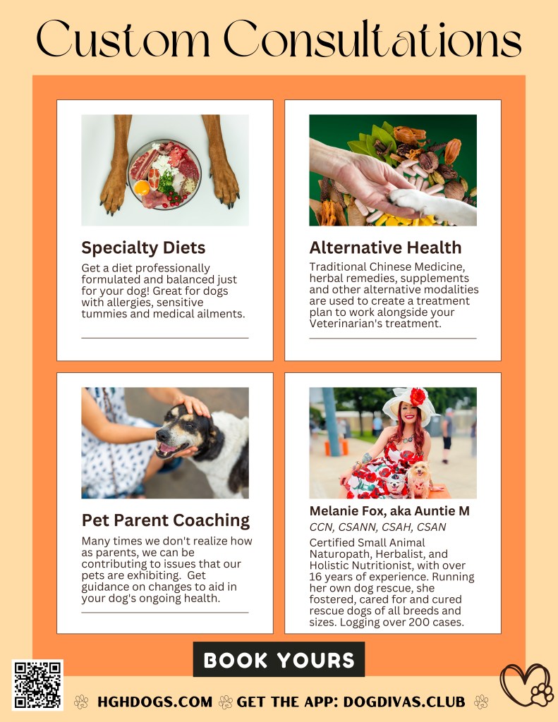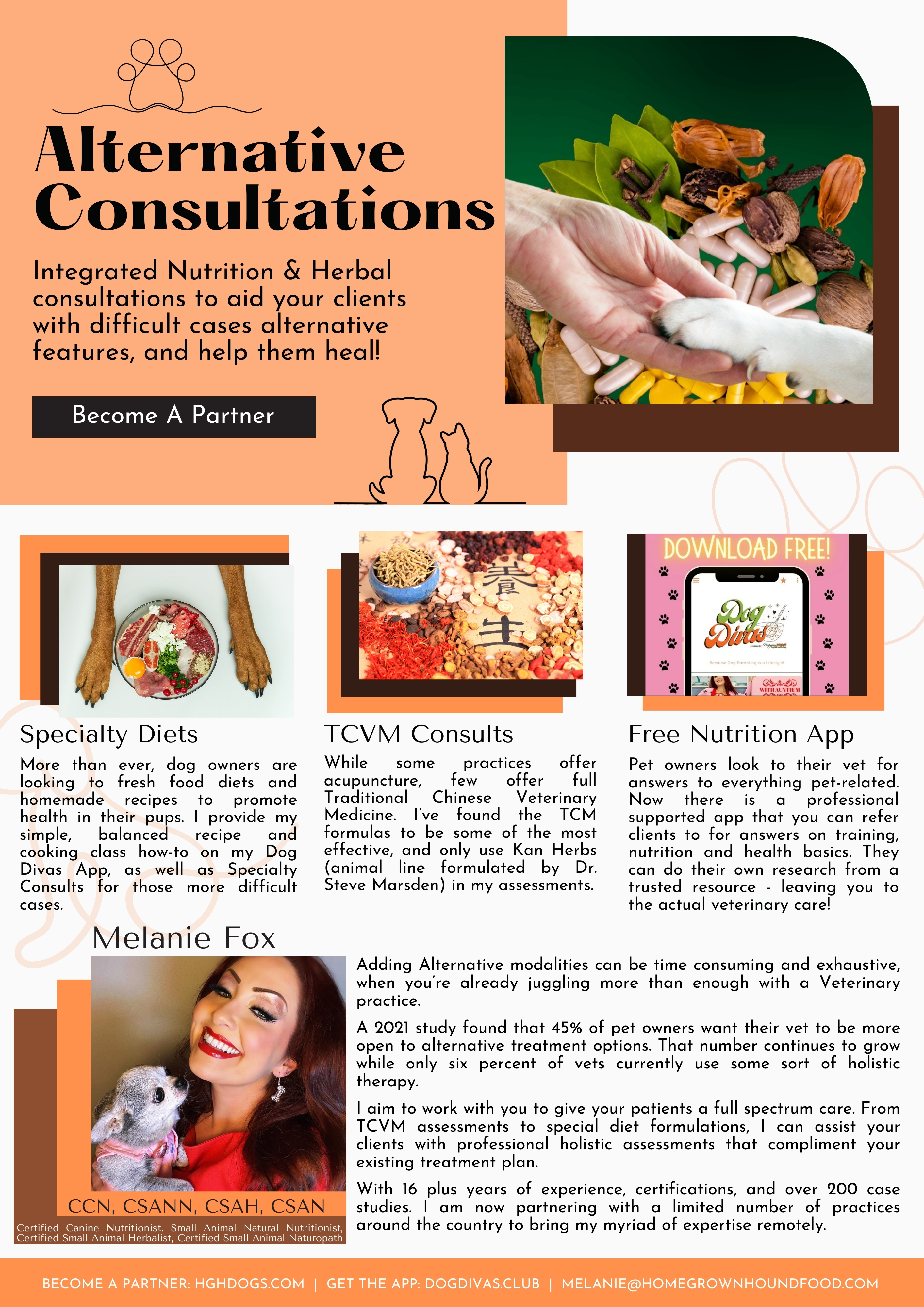 Now offering remote alternative treatment therapies and custom diet consultations to your patients! We offer consultations on all alternative modalities and specialty diet creation. Melanie Fox is a Certified Canine Nutritionist, Small Animal Natural Nutritionist, Certified Small Animal Herbalist, and Certified Small Animal Naturopath with over 16 years of experience and has helped hundreds of dogs overcome “untreatable” ailments.